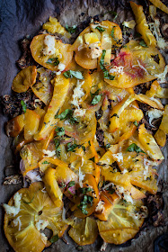 For dinner a few nights ago, I broiled golden tomatoes, eggplant, garlic, mushrooms and various herbs to make an interesting topping for potatoes, rice, pasta, or quinoa.  Not quite a sauce, I'm sure there's some sort of fancy chef word for what this is.  I think I will probably just call it Broiled Veggies with Boiled Potatoes.